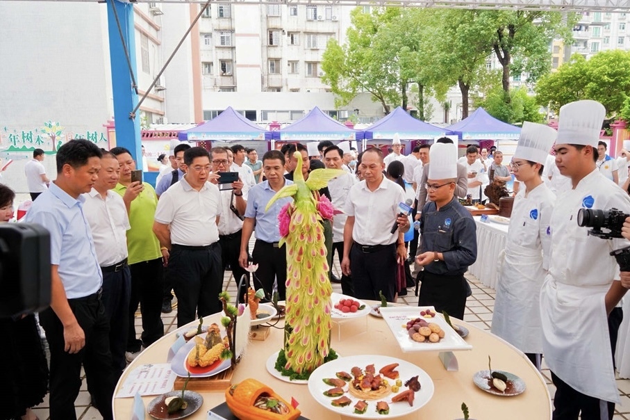与会领导、嘉宾近距离观摩参赛选手的厨艺创作,参观特色展位,并与选手们进行互动交流;评委们对参赛选手作品进行了细致评审。